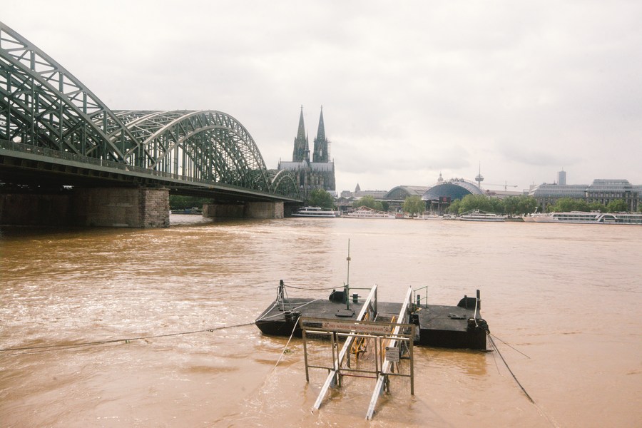 The bank of the river Rhine is seen flooded in Cologne, western Germany, on July 15, 2021. (Photo by Tang Ying/Xinhua)