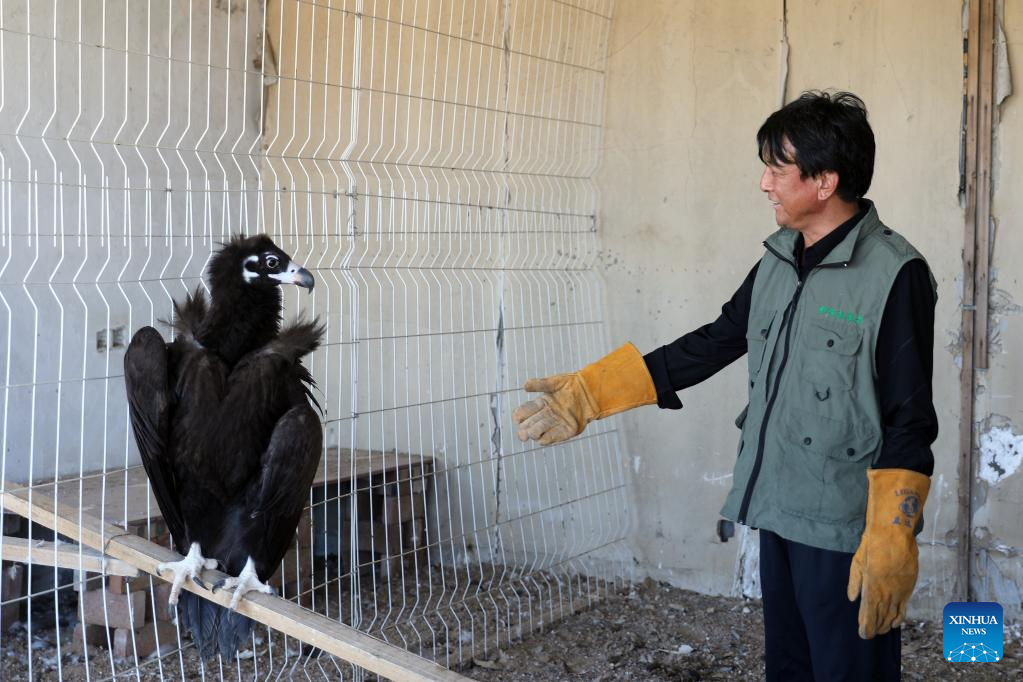 Ma Xirong checks on a vulture at a wildlife rescue station in Kangbao County of Zhangjiakou City, north China's Hebei Province, July 6, 2022.