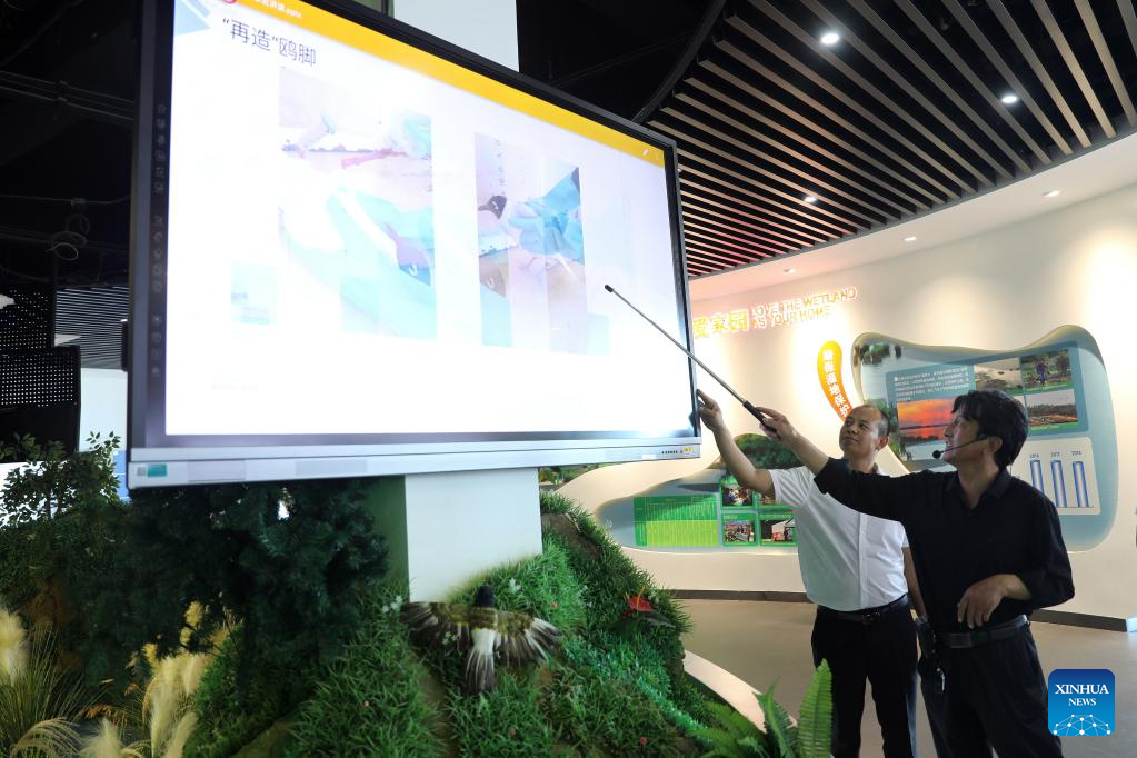 Ma Xirong (R) presents relict gulls (larus relictus) rescue work at Kangba Noel National Wetland Park in Kangbao County of Zhangjiakou City, north China's Hebei Province, July 6, 2022.