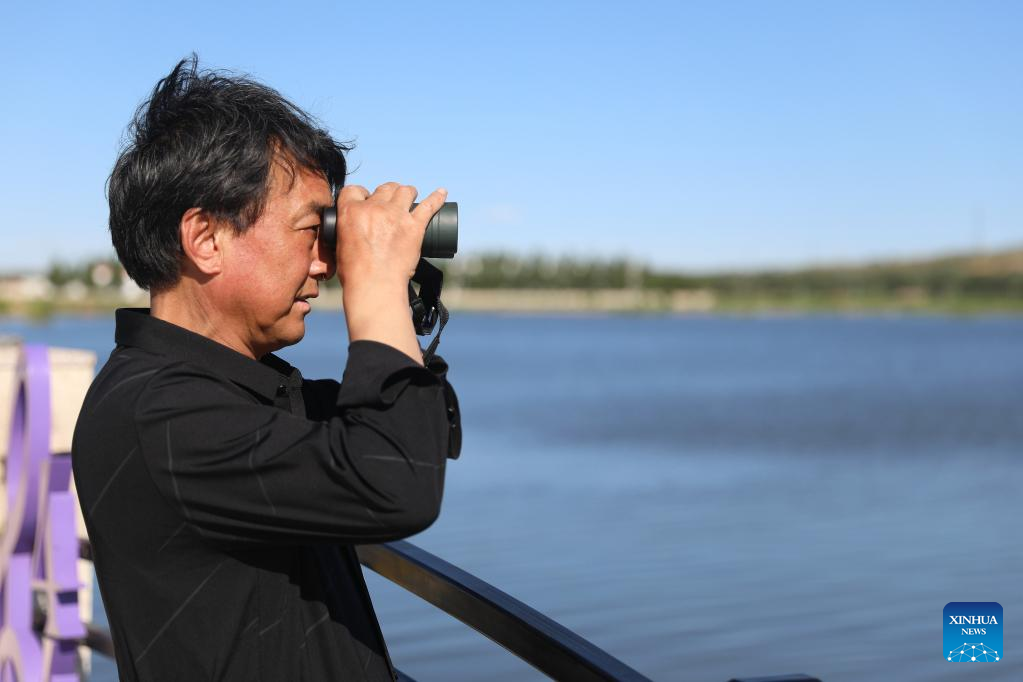 Ma Xirong observes birds at Kangba Noel National Wetland Park in Kangbao County of Zhangjiakou City, north China's Hebei Province, July 6, 2022.