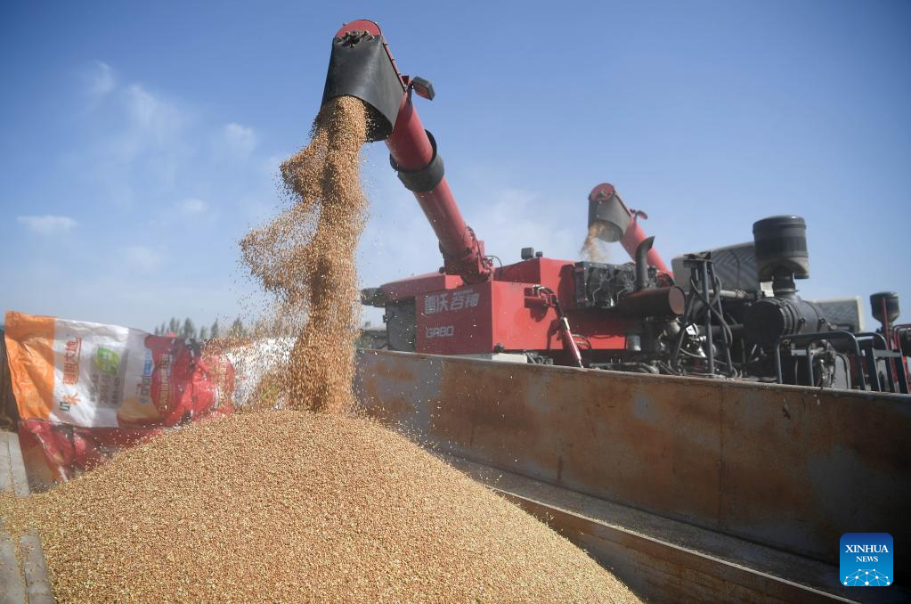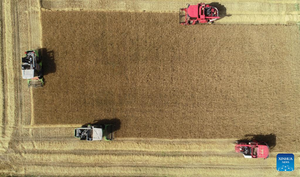 - Xinjiang farmers busy reaping winter wheat with mechanized harvesters