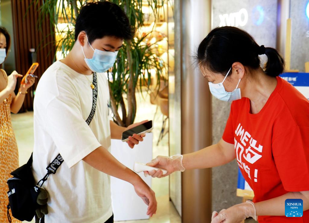 An audience has his temperature checked at a UME cinema in east China's Shanghai, July 8, 2022. Some cinemas in Shanghai resumed operation with epidemic prevention measures in place on Friday. (Xinhua/Ren Long)