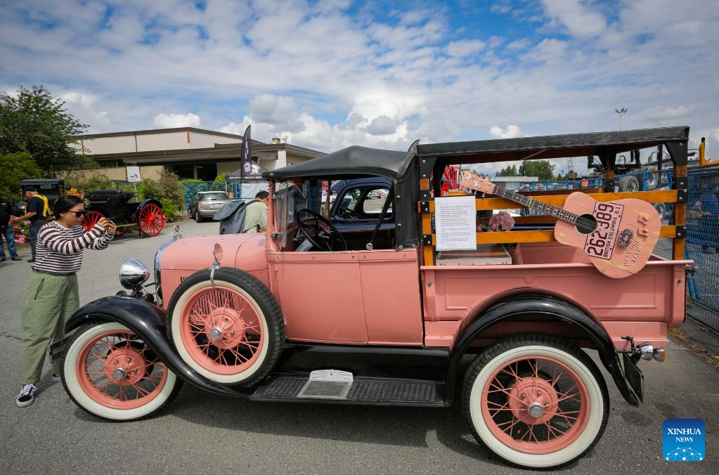 A woman takes photos of a vintage truck displayed during the National Truck Show in Surrey, British Columbia, Canada, on July 8, 2022. (Photo by Liang Sen/Xinhua)