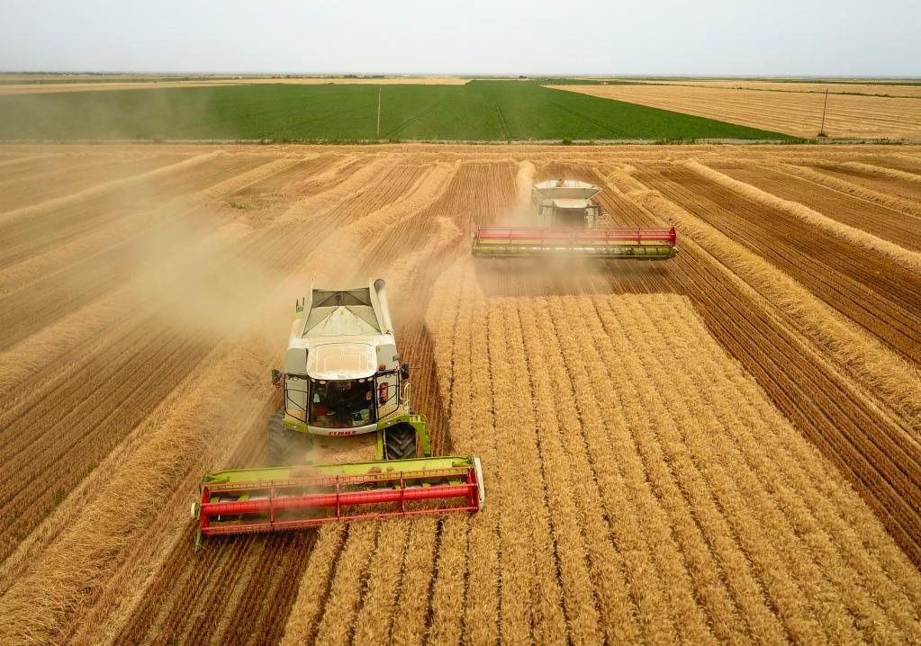 Aerial photo taken on July 7, 2022 shows combine harvesters reaping wheat in a field in Qitai County, Changji Hui Autonomous Prefecture, northwest China's Xinjiang Uygur Autonomous Region.