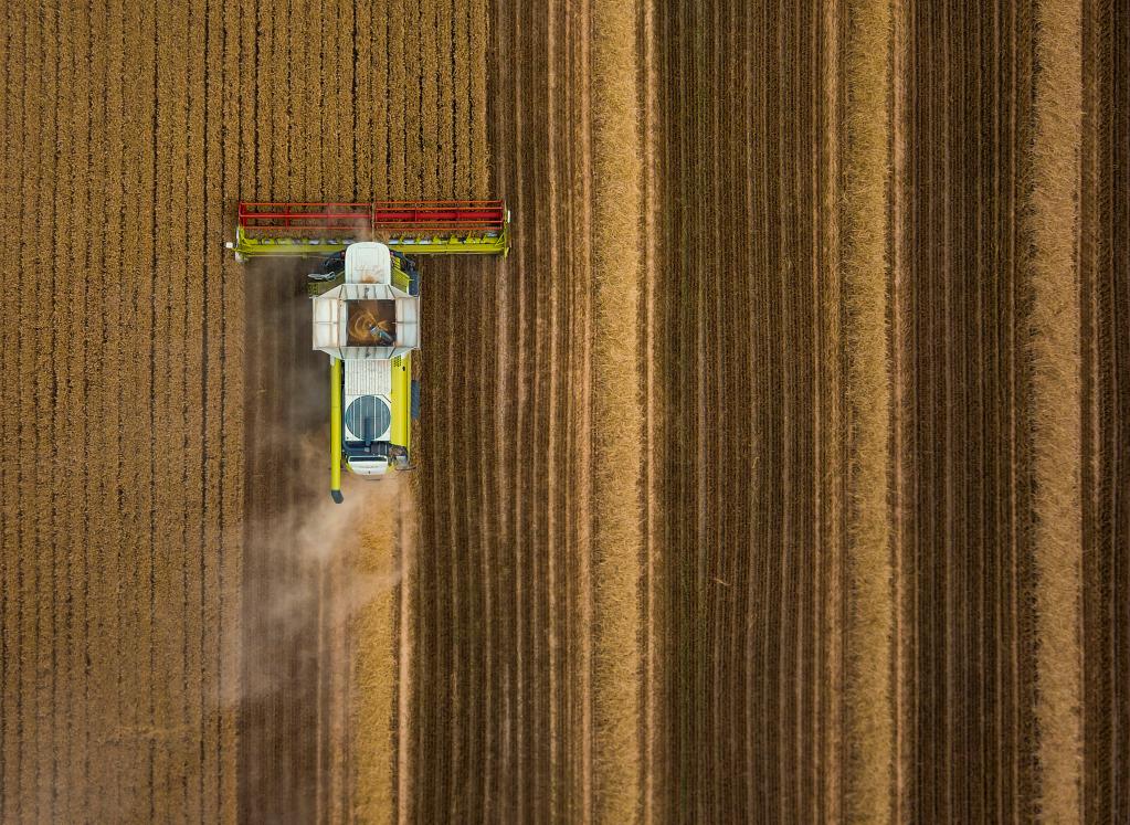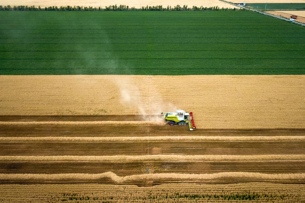Aerial photo taken on July 7, 2022 shows a combine harvester reaping wheat in a field in Qitai County, Changji Hui Autonomous Prefecture, northwest China's Xinjiang Uygur Autonomous Region.