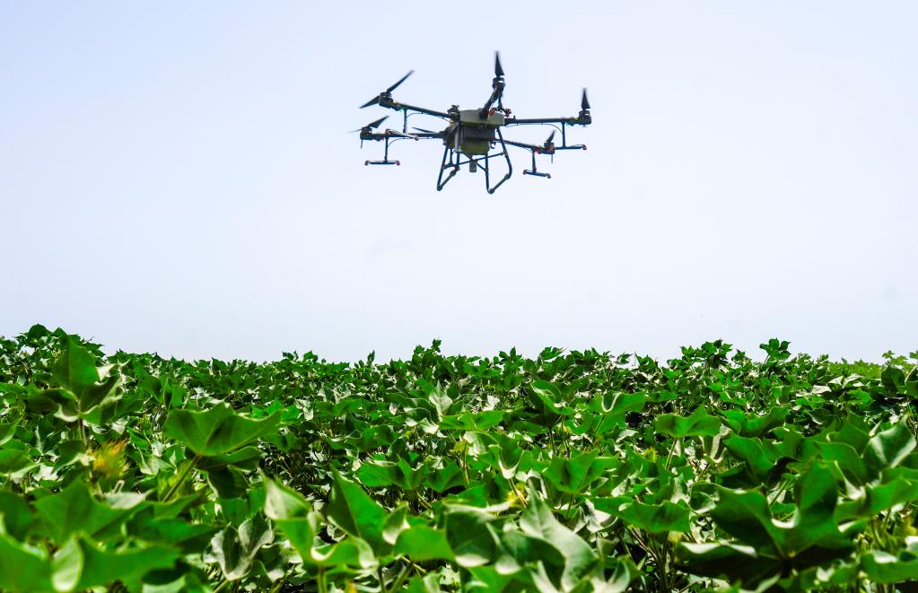 A drone carries out agricultural work over a cotton field in Korla, northwest China's Xinjiang Uygur Autonomous Region, July 6, 2022.