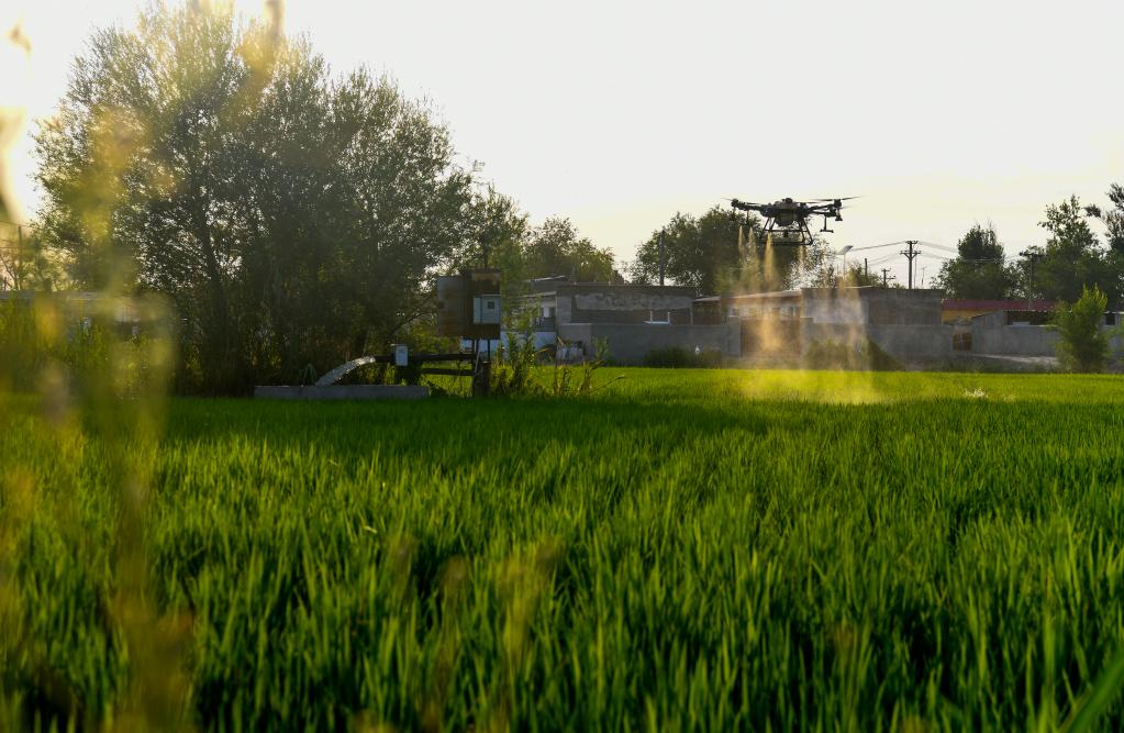 Photo taken on July 4, 2022 shows a drone carrying out agricultural work over a rice paddy field in Dujiazhuang Village, Sandaoba Township, Midong District, Urumqi, northwest China's Xinjiang Uygur Autonomous Region.