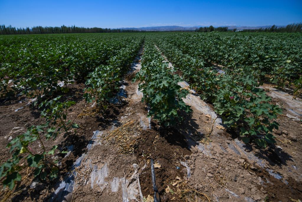 A cotton field watered with drip irrigation is seen in Manas County, northwest China's Xinjiang Uygur Autonomous Region, June 30, 2022.