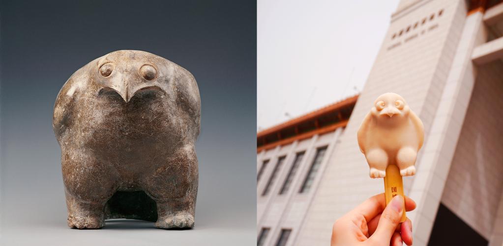 Combo photo shows the Eagle-shaped Pottery Ding vessel displayed at the National Museum of China (NMC) in Beijing, capital of China, and an eagle-shaped ice cream bar (R). (The National Museum of China/Handout via Xinhua)