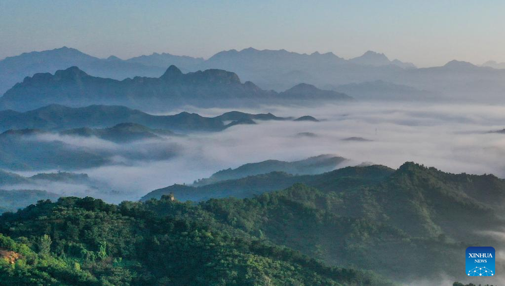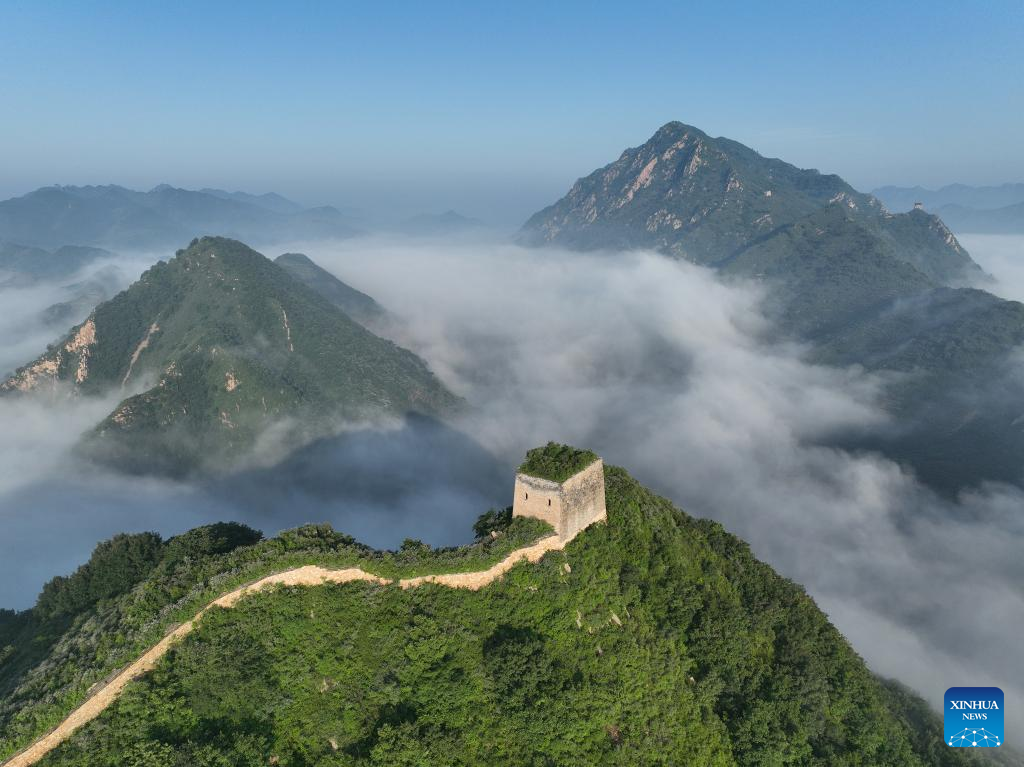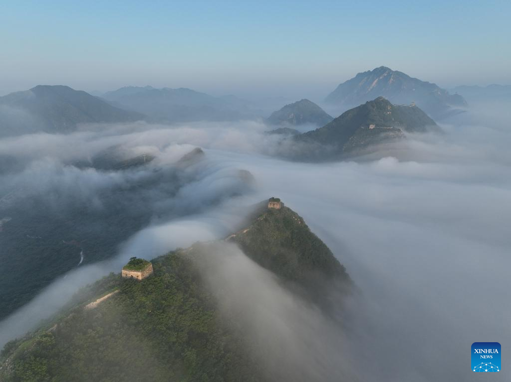 Aerial photo taken on July 11, 2022 shows clouds floating over a section of the Great Wall in Qianxi County, north China's Hebei Province. (Photo by Wang Aijun/Xinhua)