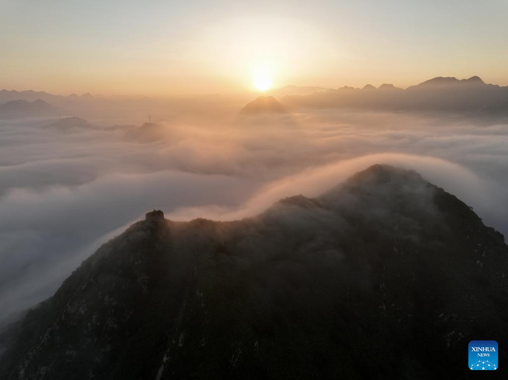 Aerial photo taken on July 11, 2022 shows clouds floating over a section of the Great Wall in Zunhua, north China's Hebei Province. (Photo by Liu Mancang/Xinhua)