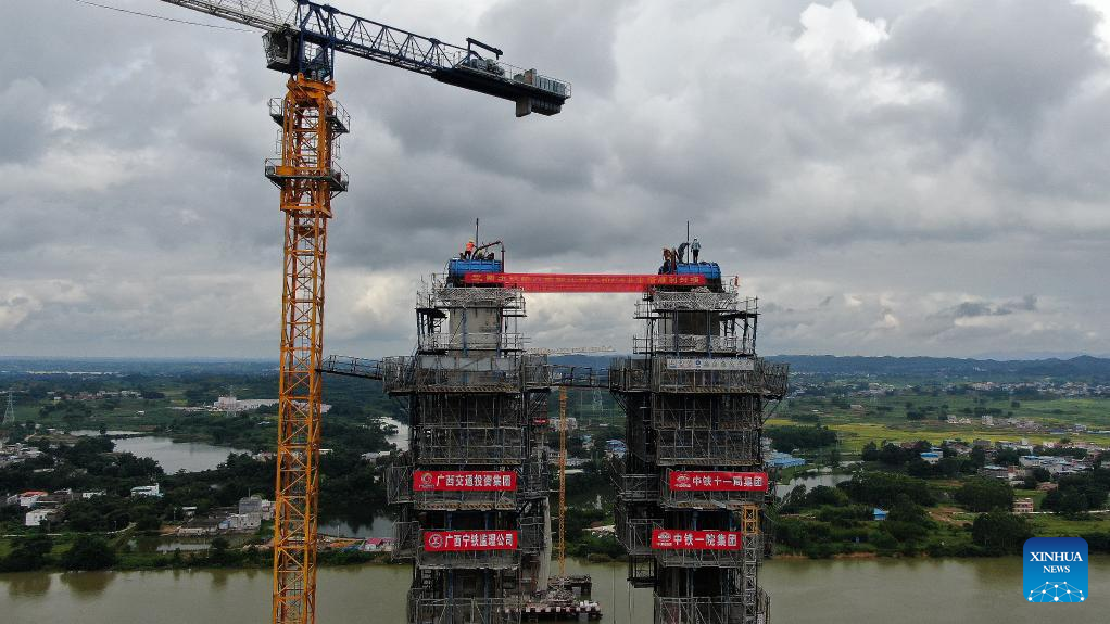 Photo taken with a mobile phone on July 10, 2022 shows the construction site of a bridge of the high-speed railway linking Nanning and Yulin of south China's Guangxi Zhuang Autonomous Region. With a designed speed of 350 km per hour, the Nanning-Yulin high-speed railway is a crucial part of the high-speed railway linking Nanning of Guangxi Zhuang Autonomous Region and Shenzhen of Guangdong Province. (Xinhua/Zhang Ailin)