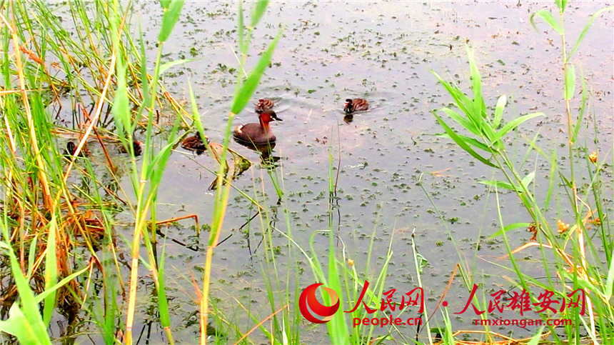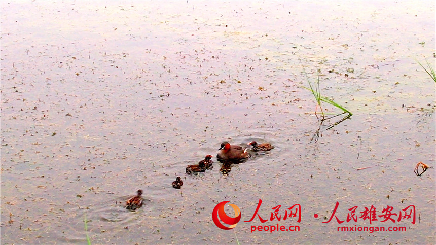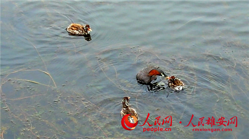 A little grebe and several fledglings take a rest on the waters of Baiyangdian Lake in the Xiong’an New Area, north China’s Hebei Province. (Photo/Gao Teng)