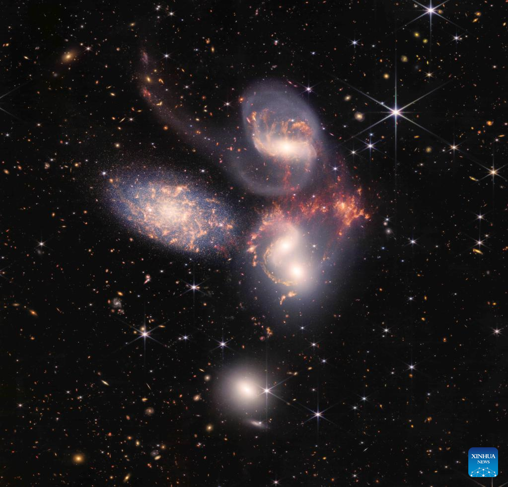 Image released by NASA on July 12, 2022 shows Stephan's Quintet, a group of five galaxies that appear close to each other in the sky: two in the middle, one toward the top, one to the upper left, and one toward the bottom. NASA released James Webb Space Telescope's first full-color images of the universe and their spectroscopic data on Tuesday, revealing the unprecedented and detailed views of the universe. (NASA, ESA, CSA, STScI/Handout via Xinhua)