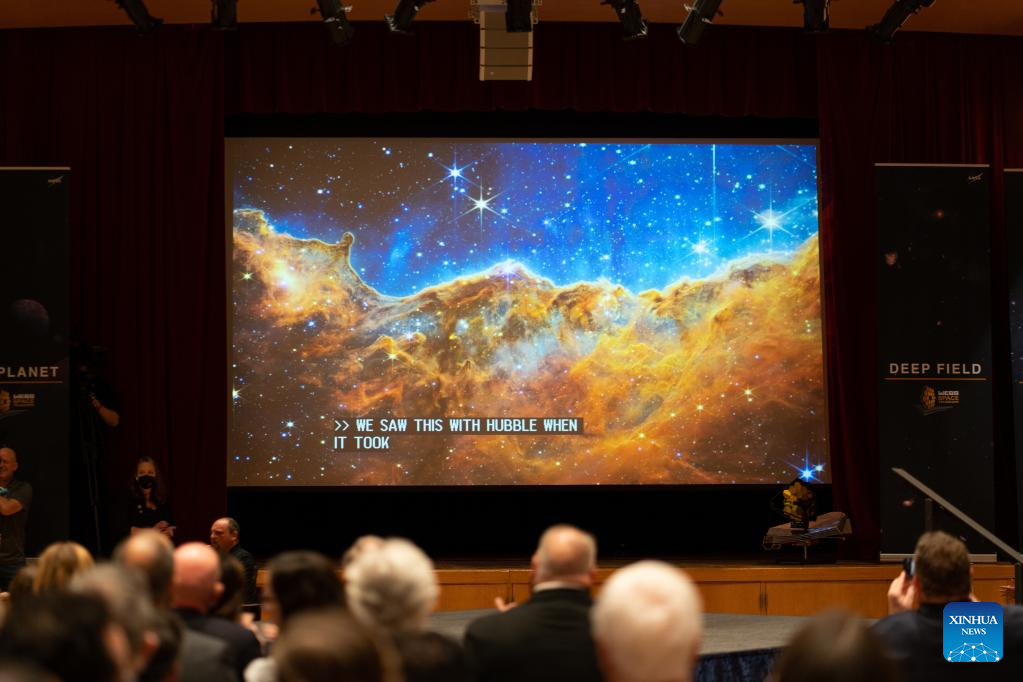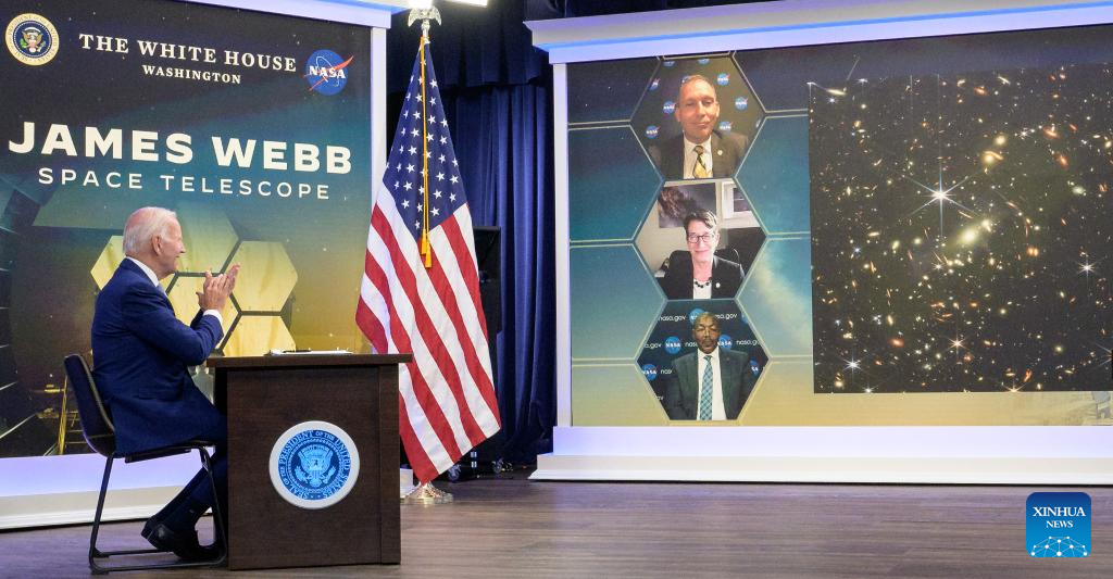 LOS ANGELES, July 12 (Xinhua) -- NASA released James Webb Space Telescope's first full-color images of the universe and their spectroscopic data on Tuesday, revealing the unprecedented and detailed views of the universe.
