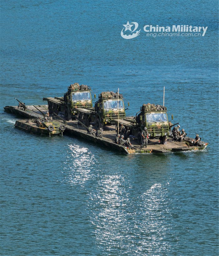 Propulsion boats attached to an engineer brigade under the PLA 72nd Group Army maneuver a ferrying pontoon bridge with onboard vehicles for river crossing during a training exercise on July 1, 2022. (eng.chinamil.com.cn/Photo by Qin Xingfeng)