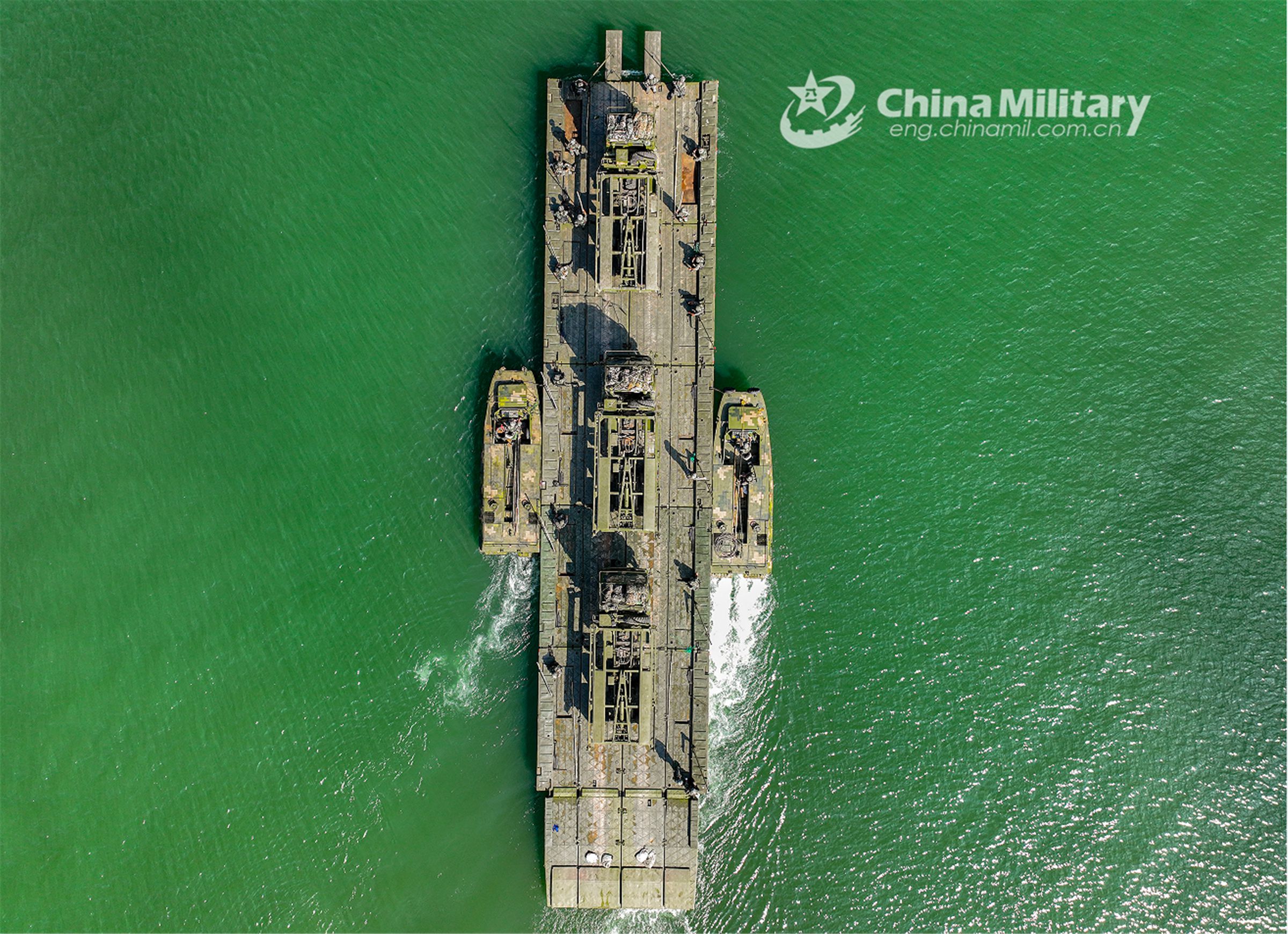 Propulsion boats attached to an engineer brigade under the PLA 72nd Group Army maneuver a ferrying pontoon bridge with onboard vehicles for river crossing during a training exercise on July 1, 2022. (eng.chinamil.com.cn/Photo by Qin Xingfeng)
