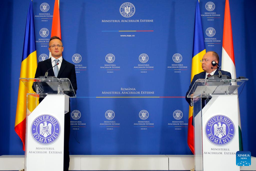 Romania's Foreign Minister Bodgan Aurescu (R) and visiting Hungarian Foreign Minister Peter Szijjarto attend a joint press conference in Bucharest, capital of Romania, July 12, 2022. The foreign affairs ministers of Romania and Hungary discussed here on Tuesday ways to increase the interconnection capacity of the two countries' gas distribution networks. (Photo by Cristian Cristel/Xinhua)