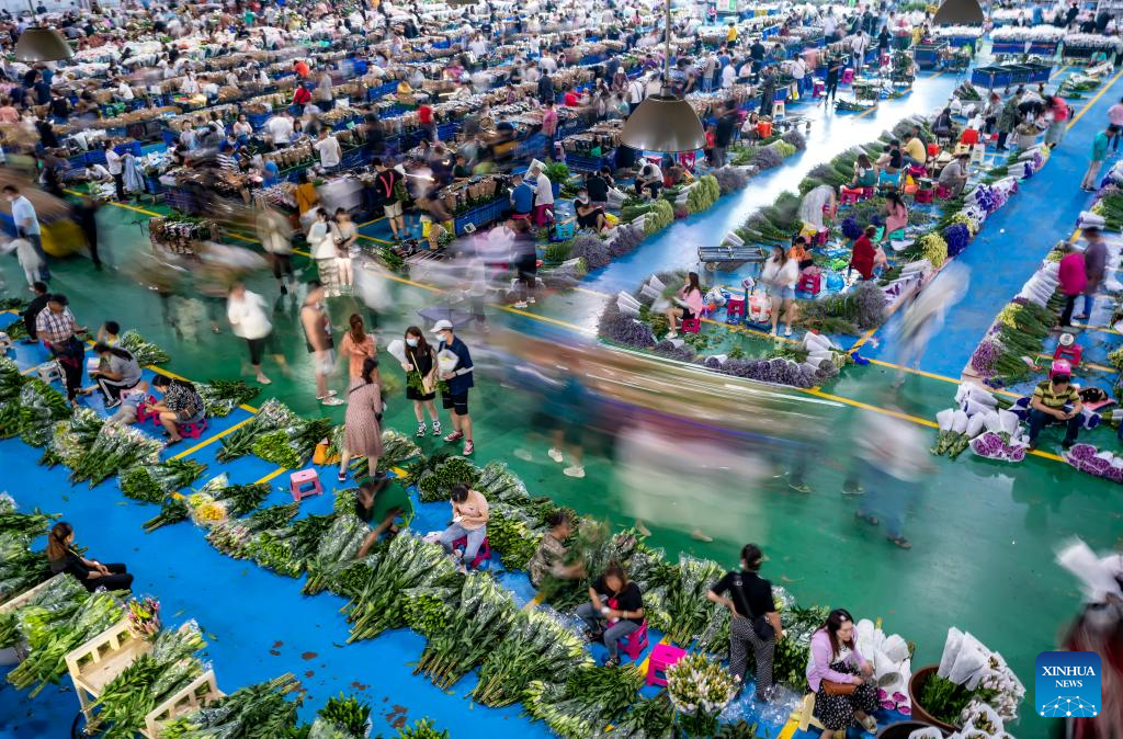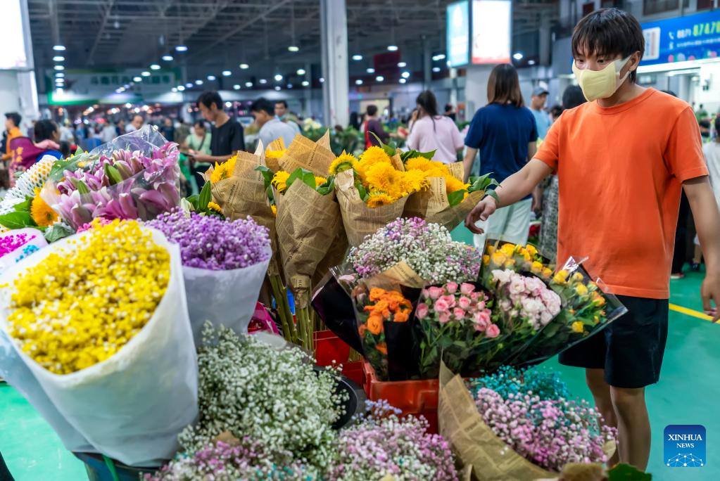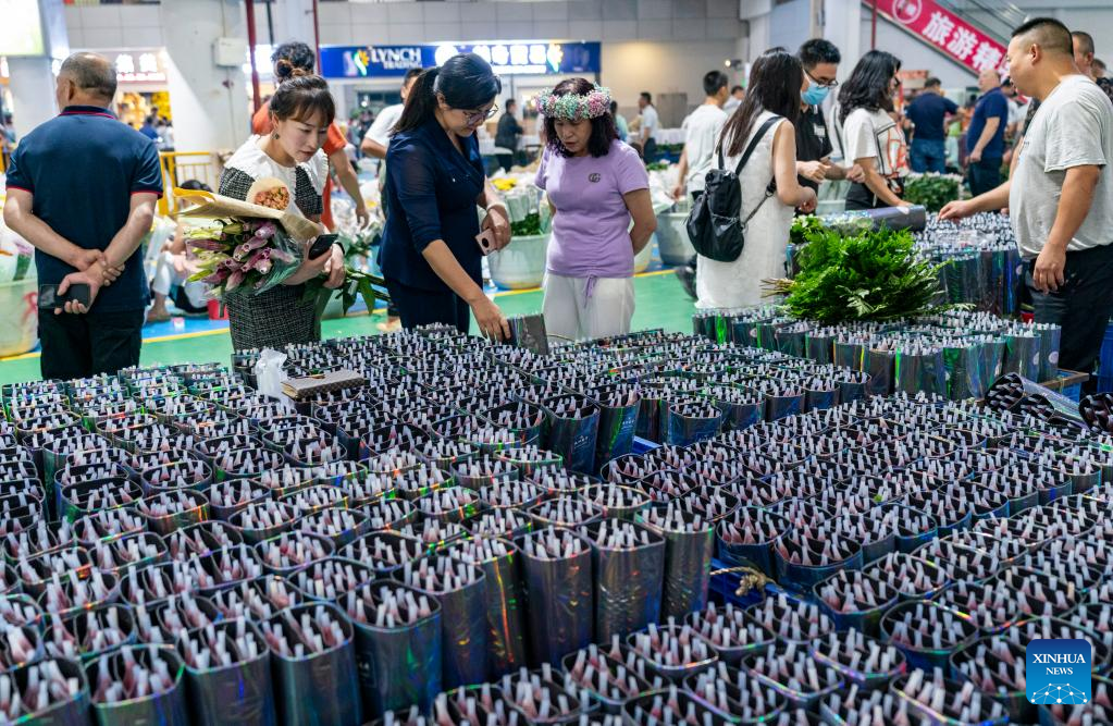 People visit the Kunming Dounan Flower Market at night in southwest China's Yunnan Province, July 12, 2022. Standing as China's largest fresh cut flower market in terms of both trade volume and export value for 23 consecutive years, Dounan has become the largest fresh cut flower trading market in Asia. In recent years, the market has vigorously developed the night economy with flower consumption, tourism and cultural experience. (Xinhua/Chen Xinbo)