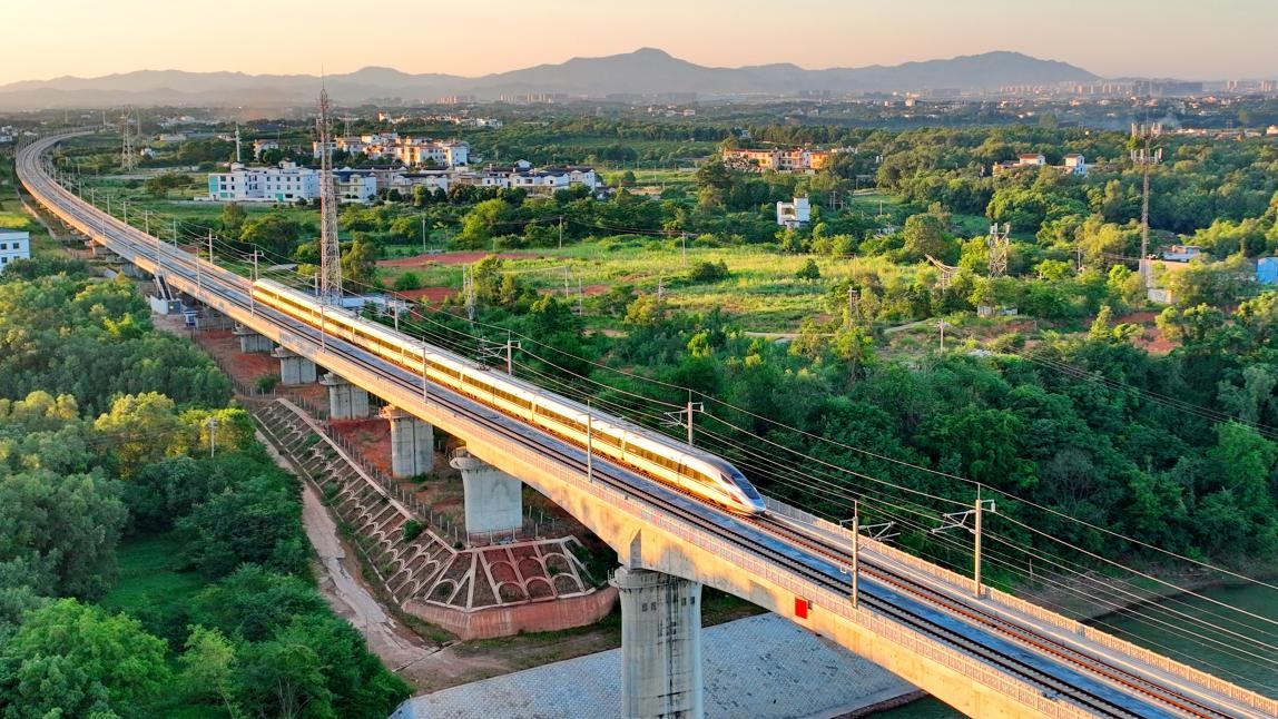 A Fuxing bullet train runs across Longling township, Nankang district, Ganzhou, east China's Jiangxi province on the Ganzhou-Shenzhen high-speed railway, July 10, 2022. (People's Daily Online/Zhu Haipeng)