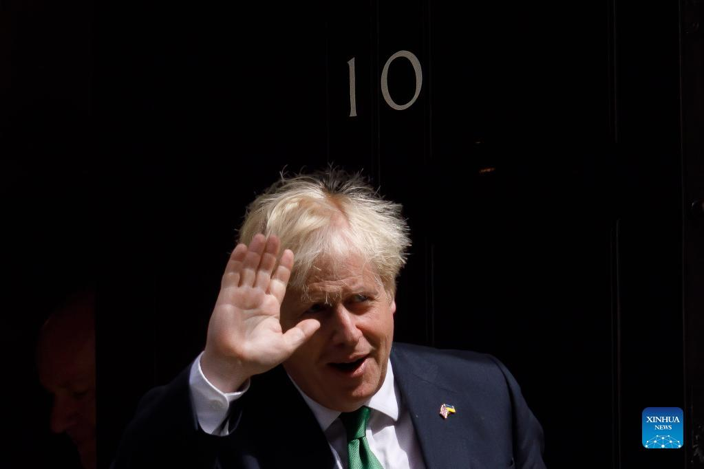 British Prime Minister Boris Johnson leaves 10 Downing Street for Prime Minister's Questions in London, Britain, July 13, 2022. Boris Johnson resigned as British prime minister and the leader of the Conservative Party in a statement to the country on July 7. The new prime minister of the United Kingdom (UK) replacing incumbent Boris Johnson will be announced on September 5, said Graham Brady, chairman of the Conservative Party's backbench 1922 Committee, on Monday. (Photo by Tim Ireland/Xinhua)