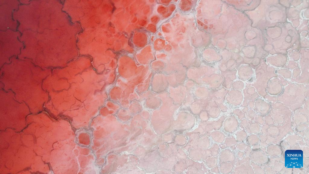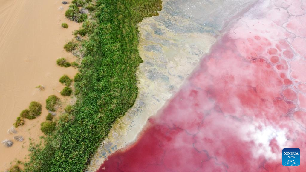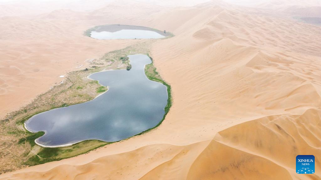 Aerial photo taken on July 13, 2022 shows a lake at the Badain Jaran Desert in north China's Inner Mongolia Autonomous Region. (Xinhua/Bei He)