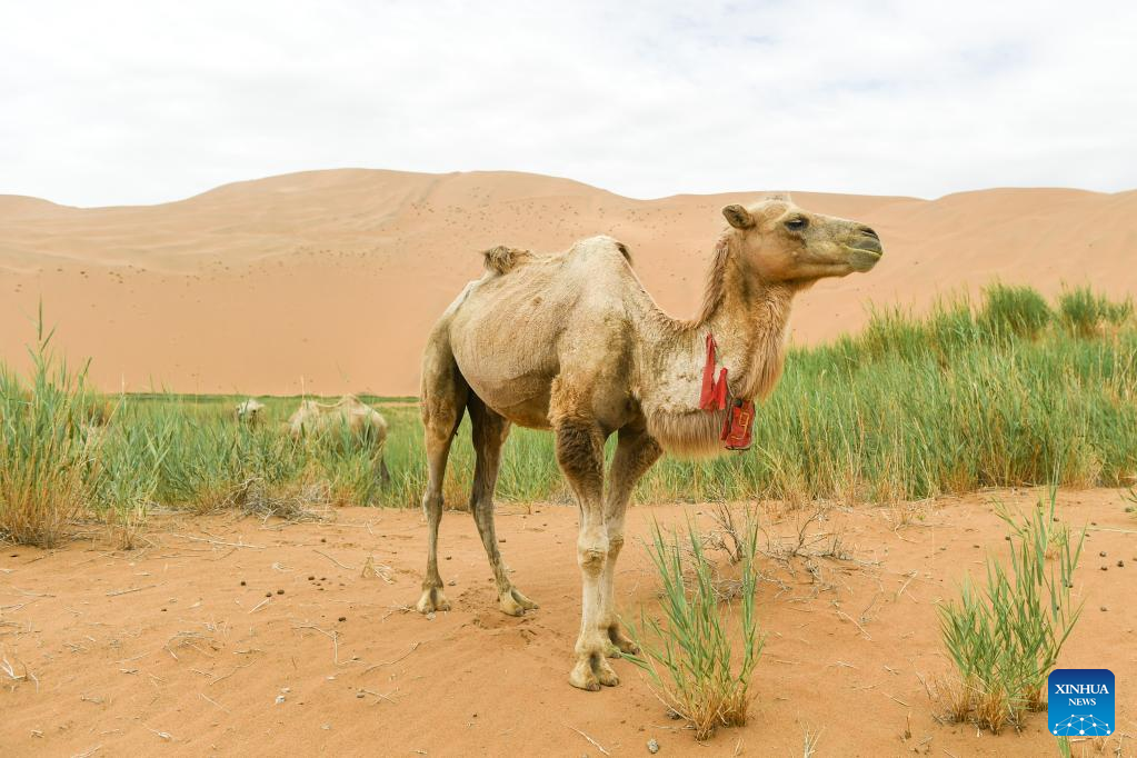 Photo taken on July 13, 2022 shows a camel at the Badain Jaran Desert in north China's Inner Mongolia Autonomous Region. (Xinhua/Bei He)