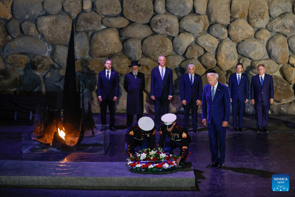 U.S. President Joe Biden (1st R, Front) attends a wreath-laying ceremony at Yad Vashem, Israel's Holocaust memorial in Jerusalem, on July 13, 2022. Biden landed in Israel on Wednesday afternoon, starting his first visit to the Middle East as president, during which he will hold talks with officials of Israel, Palestine, and Saudi Arabia. (Olivier Fitoussi/JINI via Xinhua)