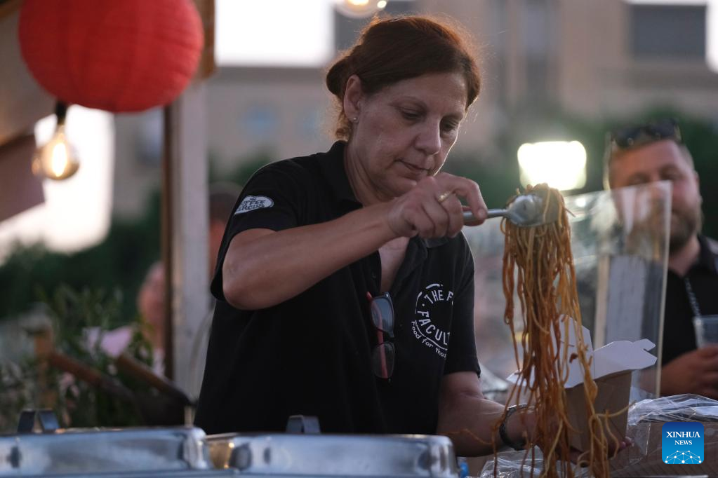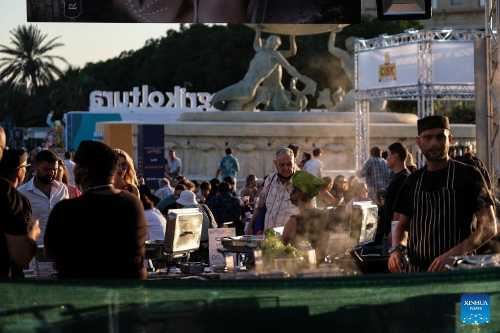 People take part in the Malta International Food Festival in Valletta, Malta, on July 13, 2022. (Photo by Jonathan Borg/Xinhua)