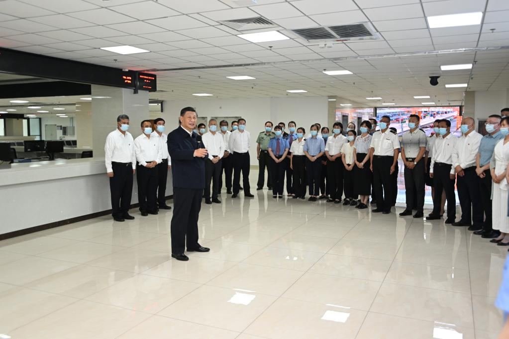 Chinese President Xi Jinping, also general secretary of the Communist Party of China Central Committee and chairman of the Central Military Commission, speaks with staff members and others while visiting the Urumqi International Land Port Area in the city of Urumqi, capital of northwest China's Xinjiang Uygur Autonomous Region, July 12, 2022. (Xinhua/Xie Huanchi)