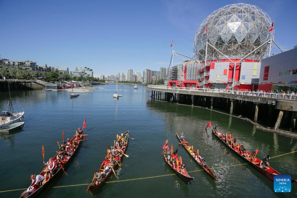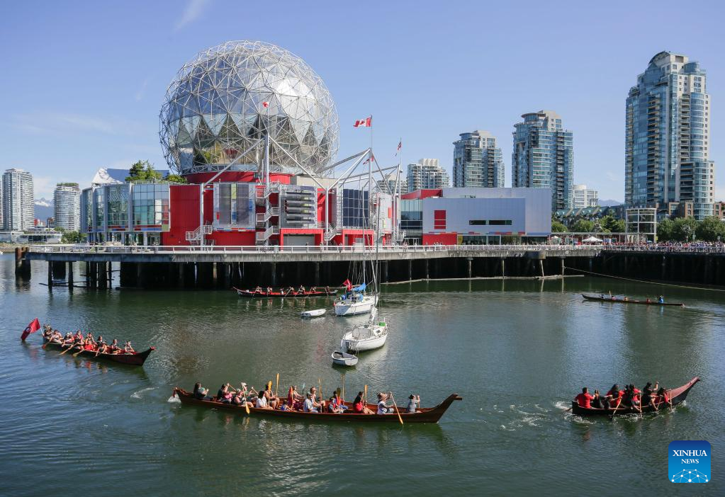 Indigenous canoes are seen in front of Science World during a canoe arrival ceremony in Vancouver, British Columbia, Canada, on July 14, 2022. Indigenous people participated in the canoe arrival ceremony on Thursday to mark the opening of the Sacred Journey exhibition at Science World in Vancouver. The Sacred Journey is an exhibition showcasing Northwest Coast canoe cultures and the indigenous people's way of life. (Photo by Liang Sen/Xinhua)