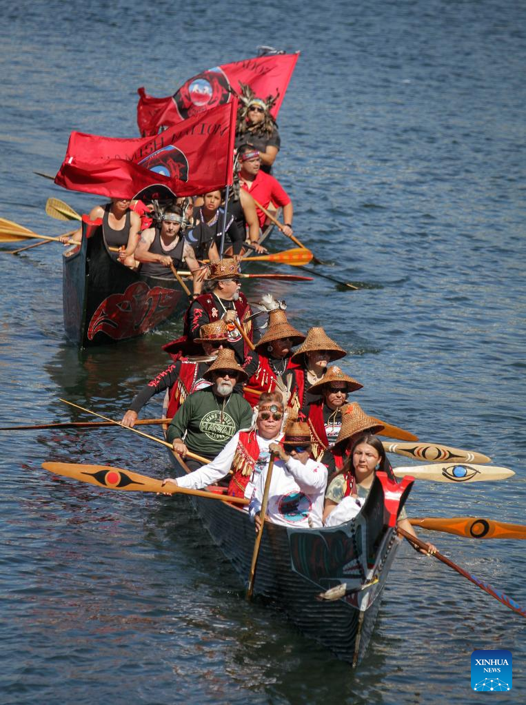 Indigenous canoes circle around in front of Science World during a canoe arrival ceremony in Vancouver, British Columbia, Canada, on July 14, 2022. Indigenous people participated in the canoe arrival ceremony on Thursday to mark the opening of the Sacred Journey exhibition at Science World in Vancouver. The Sacred Journey is an exhibition showcasing Northwest Coast canoe cultures and the indigenous people's way of life. (Photo by Liang Sen/Xinhua)