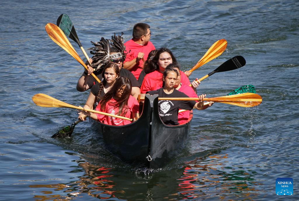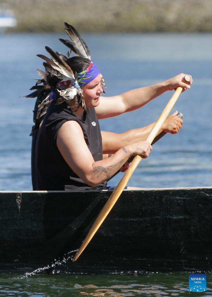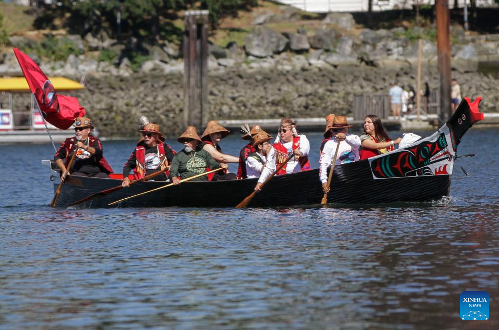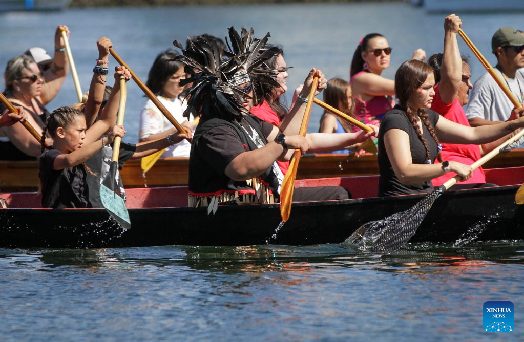 Indigenous people paddle during a canoe arrival ceremony at False Creek in Vancouver, British Columbia, Canada, on July 14, 2022. Indigenous people participated in the canoe arrival ceremony on Thursday to mark the opening of the Sacred Journey exhibition at Science World in Vancouver. The Sacred Journey is an exhibition showcasing Northwest Coast canoe cultures and the indigenous people's way of life. (Photo by Liang Sen/Xinhua)