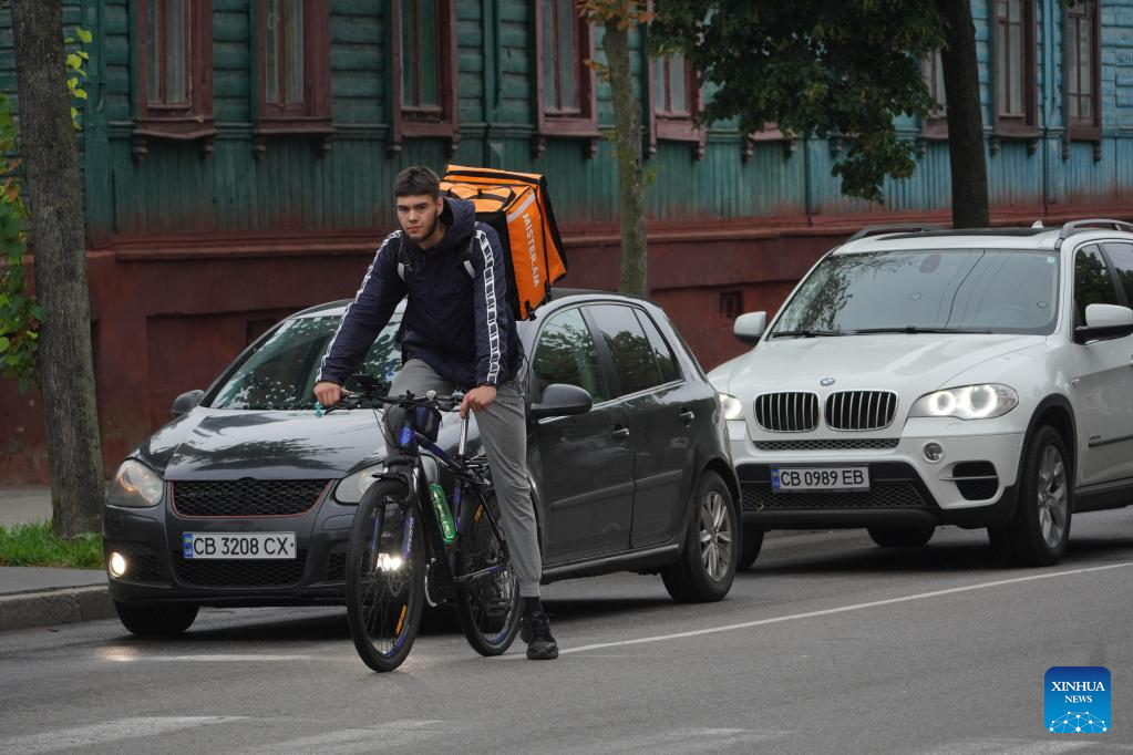 A deliveryman waits for the green light in Chernihiv, Ukraine, July 13, 2022. (Photo by Roman Petushkov/Xinhua)