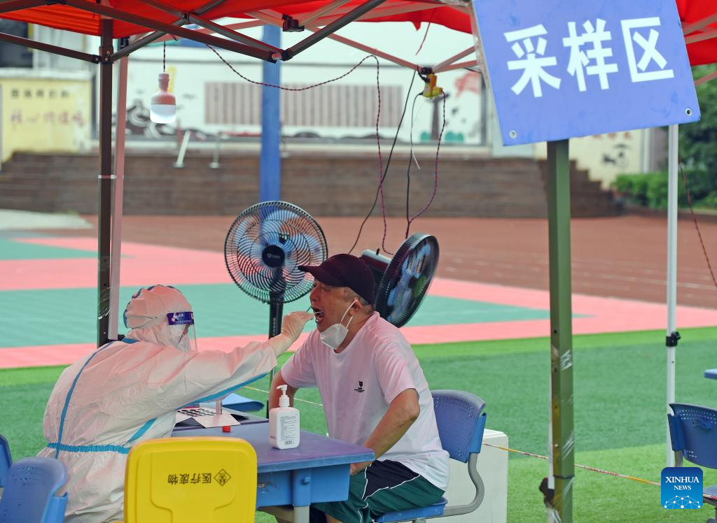 A medical worker takes a swab sample from a citizen for nucleic acid testing in Bengshan District of Bengbu City, east China's Anhui Province, July 16, 2022.(Xinhua/Zhou Mu)