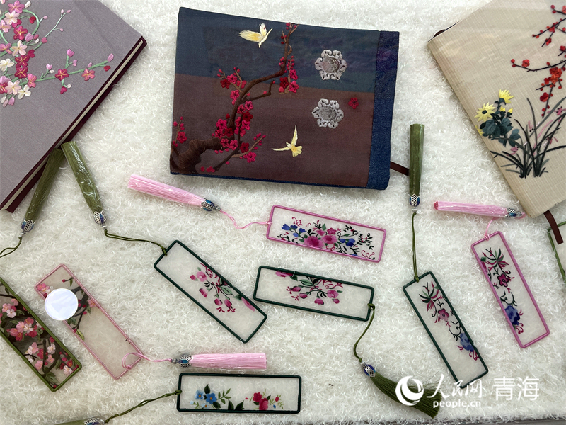 Photo shows some of the various innovative embroidery products produced in the Salar embroidery tradition. (People’s Daily Online/Kuang Yu)