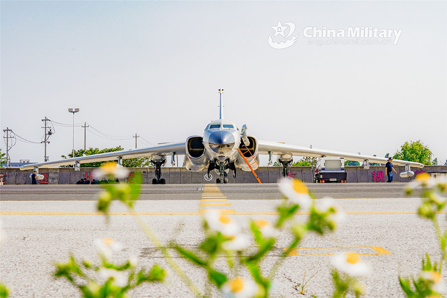 Two H6 bombers attached to an aviation regiment with the navy under PLA Eastern Theatre Command see off another warplane during a round-the-clock flight training exercise on June 15, 2022. (eng.chinamil.com.cn/Photo by Hu Fei)