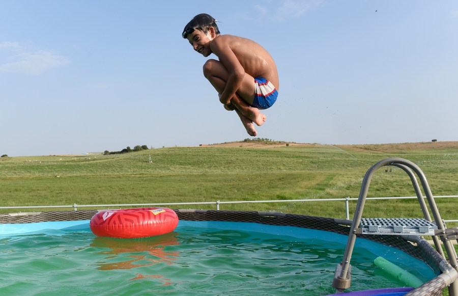 A child jumps into a pool in Caceres, Spain, July 13, 2022.(Photo by Gustavo Valiente/Xinhua)