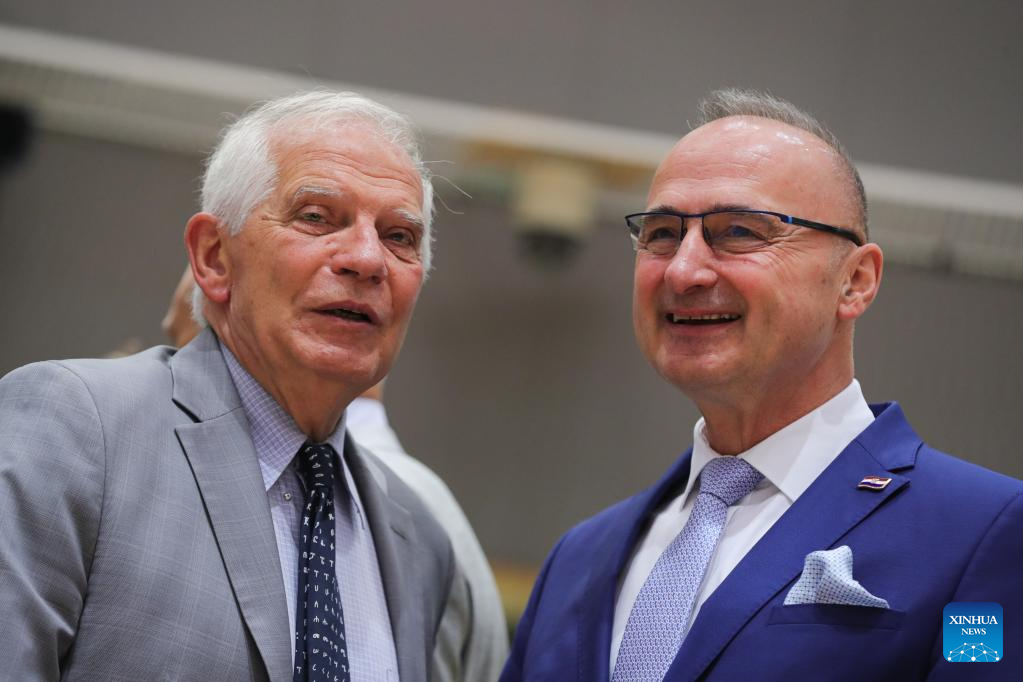 EU High Representative for Foreign Affairs and Security Policy Josep Borrell Fontelles (L) and Croatian Foreign Minister Gordan Grlic Radman talk before the meeting of the EU Foreign Affairs Council in Brussels, Belgium, July 18, 2022. (Xinhua/Zheng Huansong)