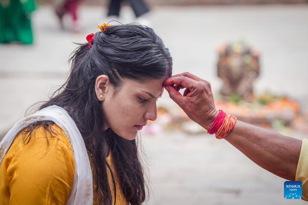 A devotee receives tika on her forehead after worshipping Lord Shiva during the first Monday of the holy month of Shrawan in Lalitpur, Nepal, July 18, 2022. The holy month of Shrawan is considered auspicious by Hindus for praying to Lord Shiva for happiness and prosperity. (Photo by Hari Maharjan/Xinhua)