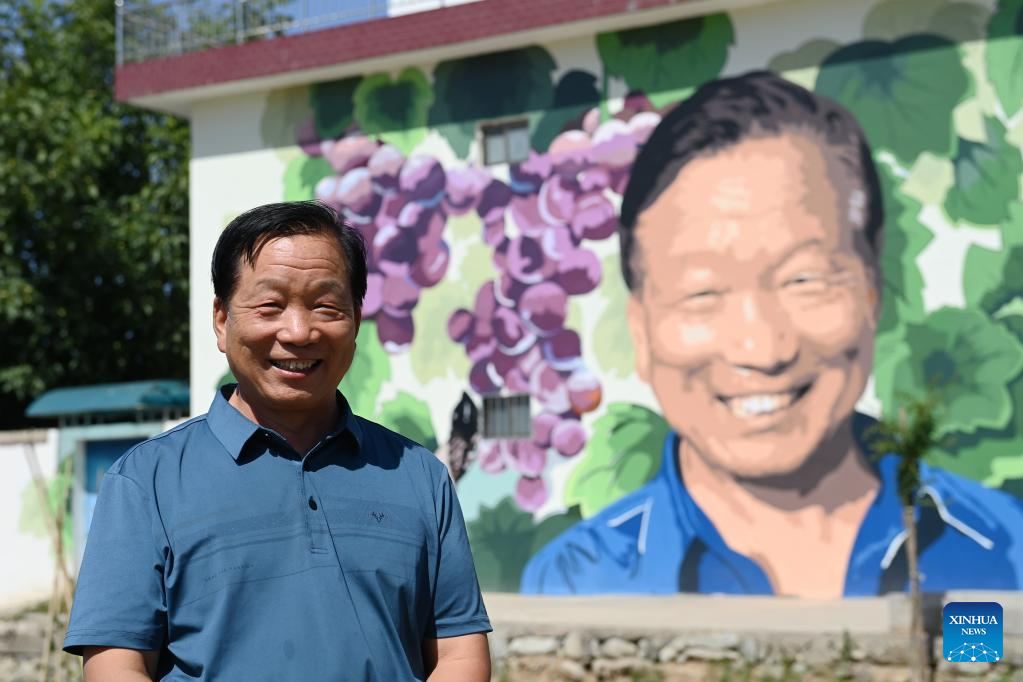 Villager Wang Yan poses for a photo in front of his portrait on the wall in Caijiapo Village, Huyi District of Xi'an, northwest China's Shaanxi Province, on July 6, 2022. Faculty and students of the Xi'an Academy of Fine Arts have been working with artists to transform villages by practicing their profession. Such transformation, combining rural tradition with modern lifestyles, turns plain grain fields and farmhouses into places of interest that promote rural culture and rural tourism. (Xinhua/Li Yibo)