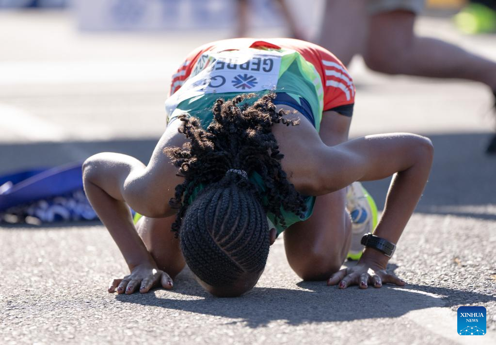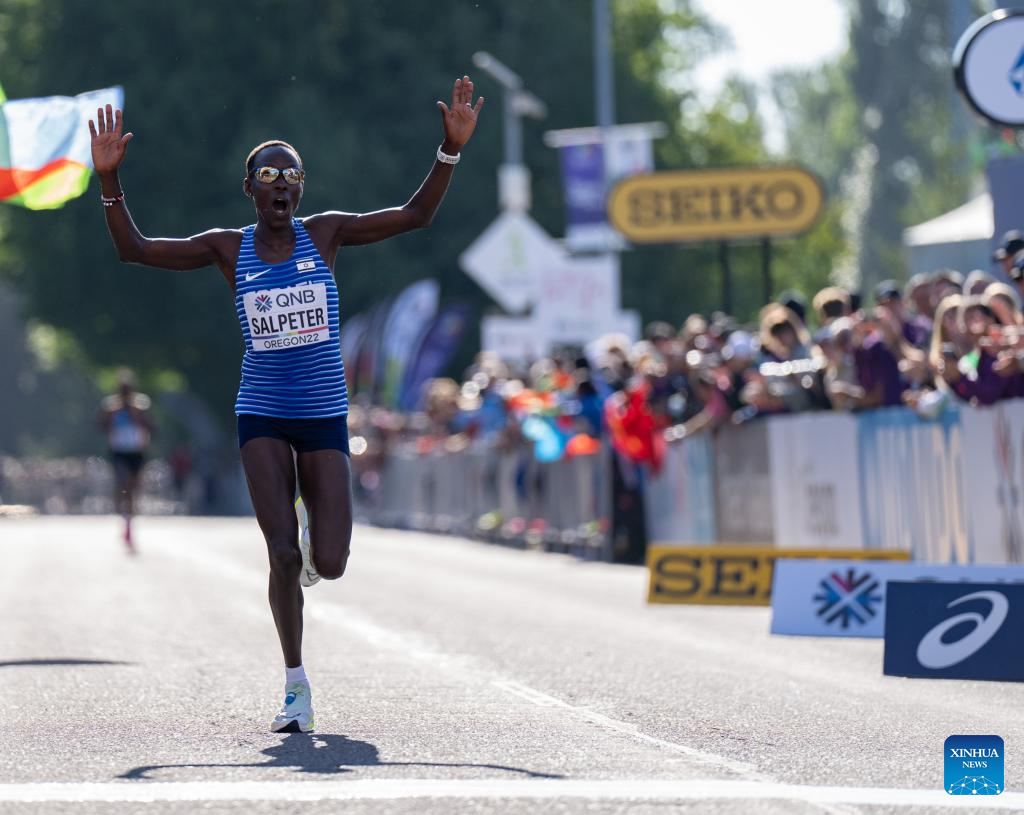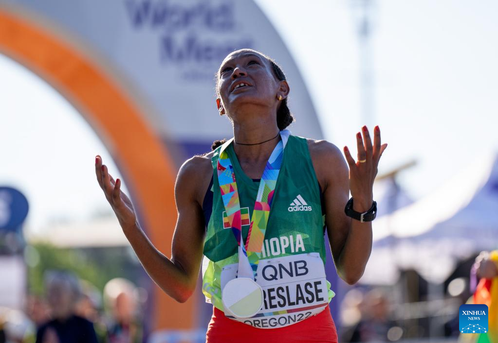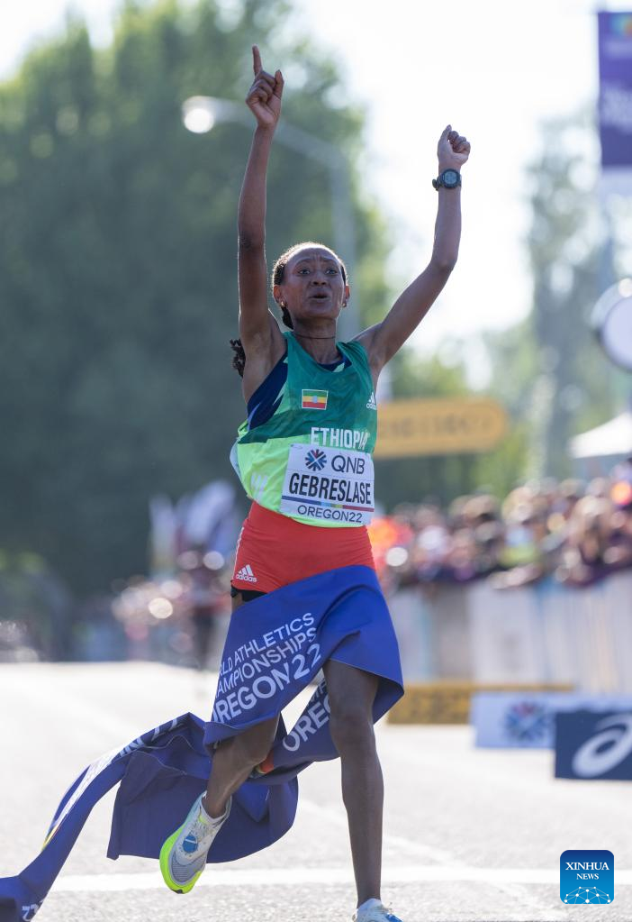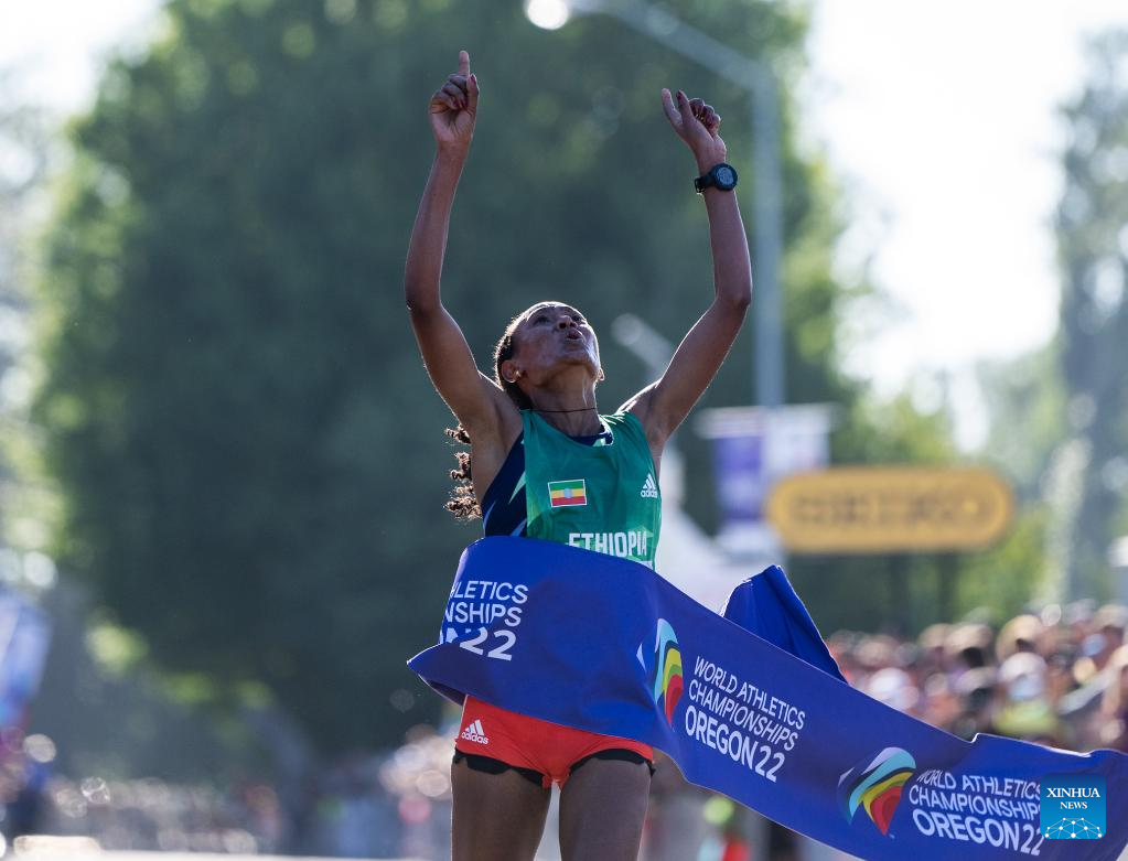 Gotytom Gebreslaseof Ethiopia celebrates after winning the women's marathon final at the World Athletics Championships Oregon22 in Eugene, Oregon, the United States, July 18, 2022. (Xinhua/Wang Ying)