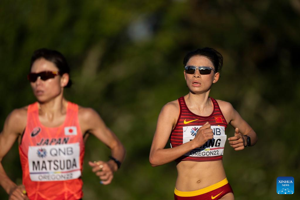 China's Zhang Deshun (R) competes during the women's marathon final at the World Athletics Championships Oregon22 in Eugene, Oregon, the United States, July 18, 2022. (Xinhua/Wang Ying)