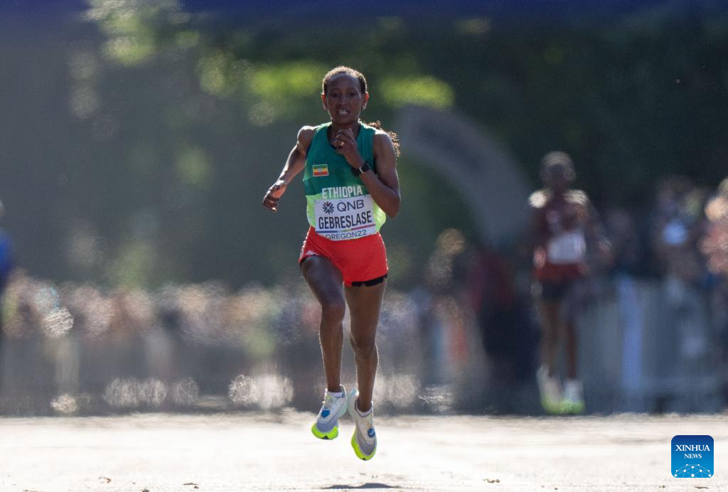 Gotytom Gebreslase of Ethiopia competes during the women's marathon final at the World Athletics Championships Oregon22 in Eugene, Oregon, the United States, July 18, 2022. (Xinhua/Wang Ying)