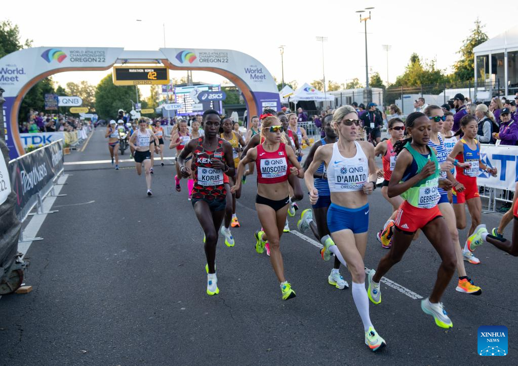 Runners start during the women's marathon final at the World Athletics Championships Oregon22 in Eugene, Oregon, the United States, July 18, 2022. (Xinhua/Wang Ying)