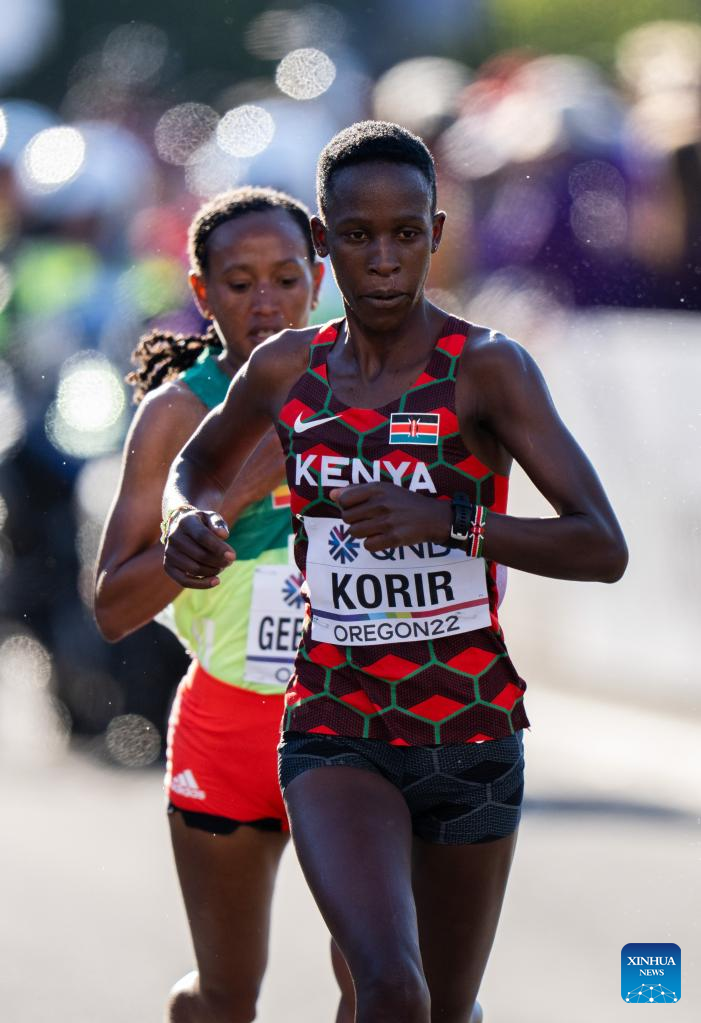 Judith Jeptum Korir (R) of Kenya competes during the women's marathon final at the World Athletics Championships Oregon22 in Eugene, Oregon, the United States, July 18, 2022. (Xinhua/Wang Ying)