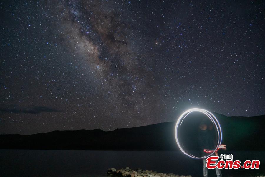 Stars sparkle in the sky over Yamdrok Lake in Nagarze County of Shannan Prefecture, Southwest China's Tibet Autonomous Region. The Yamdrok Lake is 4,441 meters above sea level and one of the three holy lakes in Tibet region. (Photo: China News Service/Jiang Feibo)