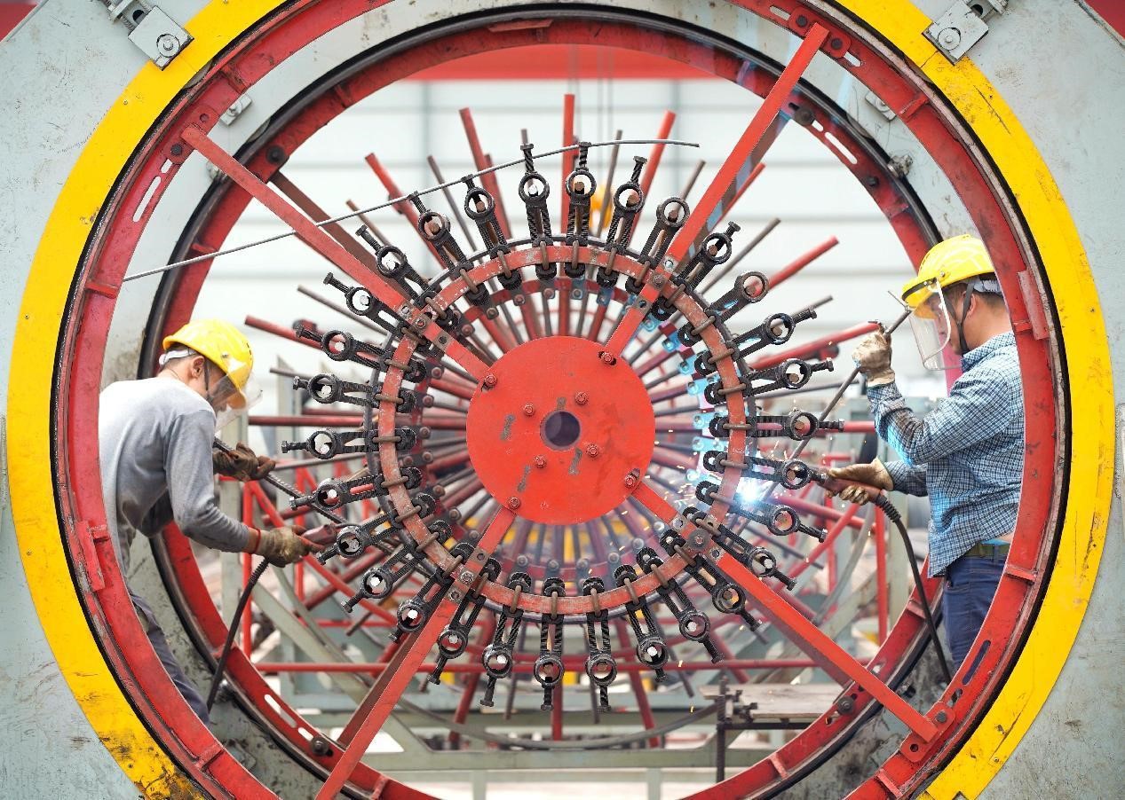 Workers produce prefabricated steel beams with a seam welding machine at a construction site of the Huzhou-Hangzhou expressway in Qianjin township, Nanxun district, Huzhou, east China's Zhejiang province, July 11, 2022. (People's Daily Online/ Zhang Bin)