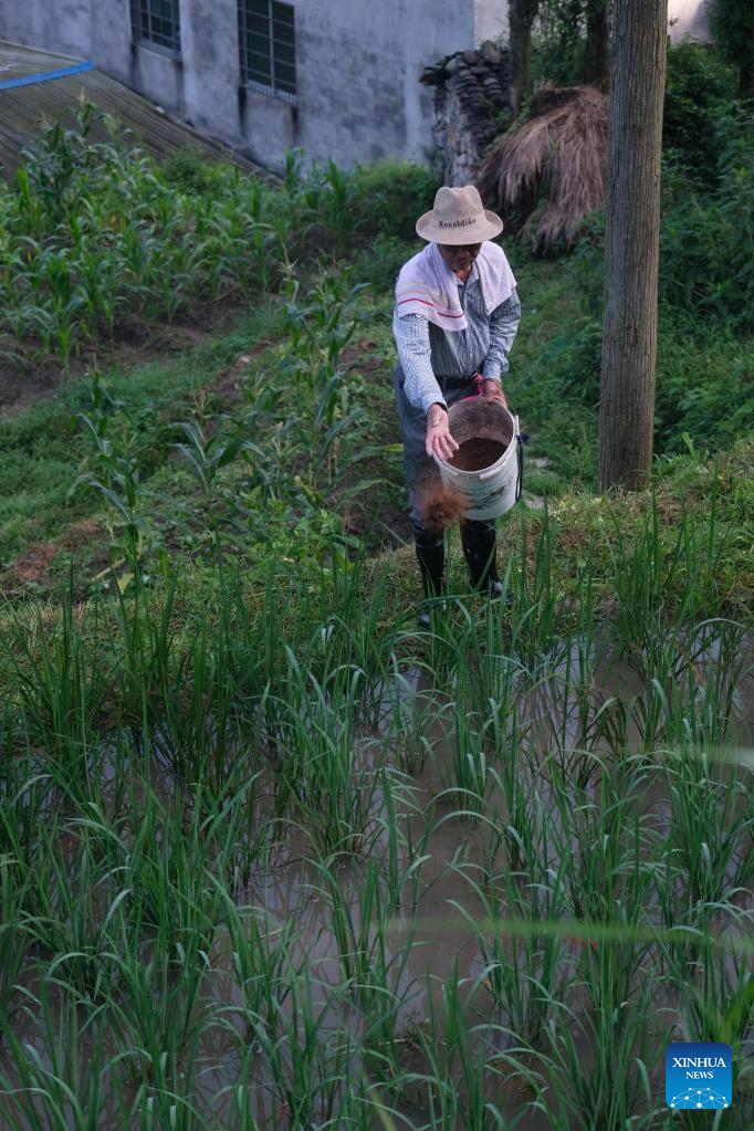 A farmer releases fish fry into a rice field in Xiaozhoushan Township, Qingtian County, east China's Zhejiang Province, June 11, 2020.