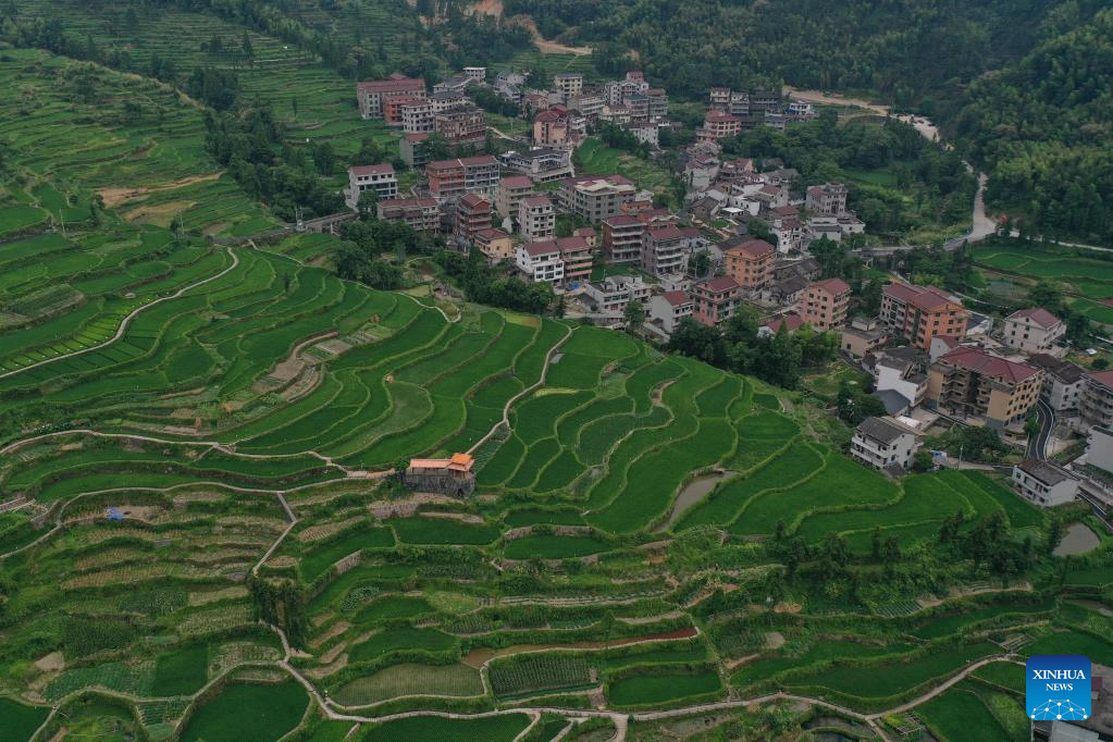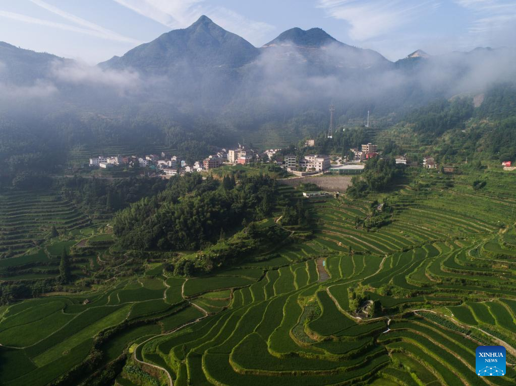 Aerial photo taken on July 25, 2019 shows terraced rice fields in Xiaozhoushan Township, Qingtian County, east China's Zhejiang Province.